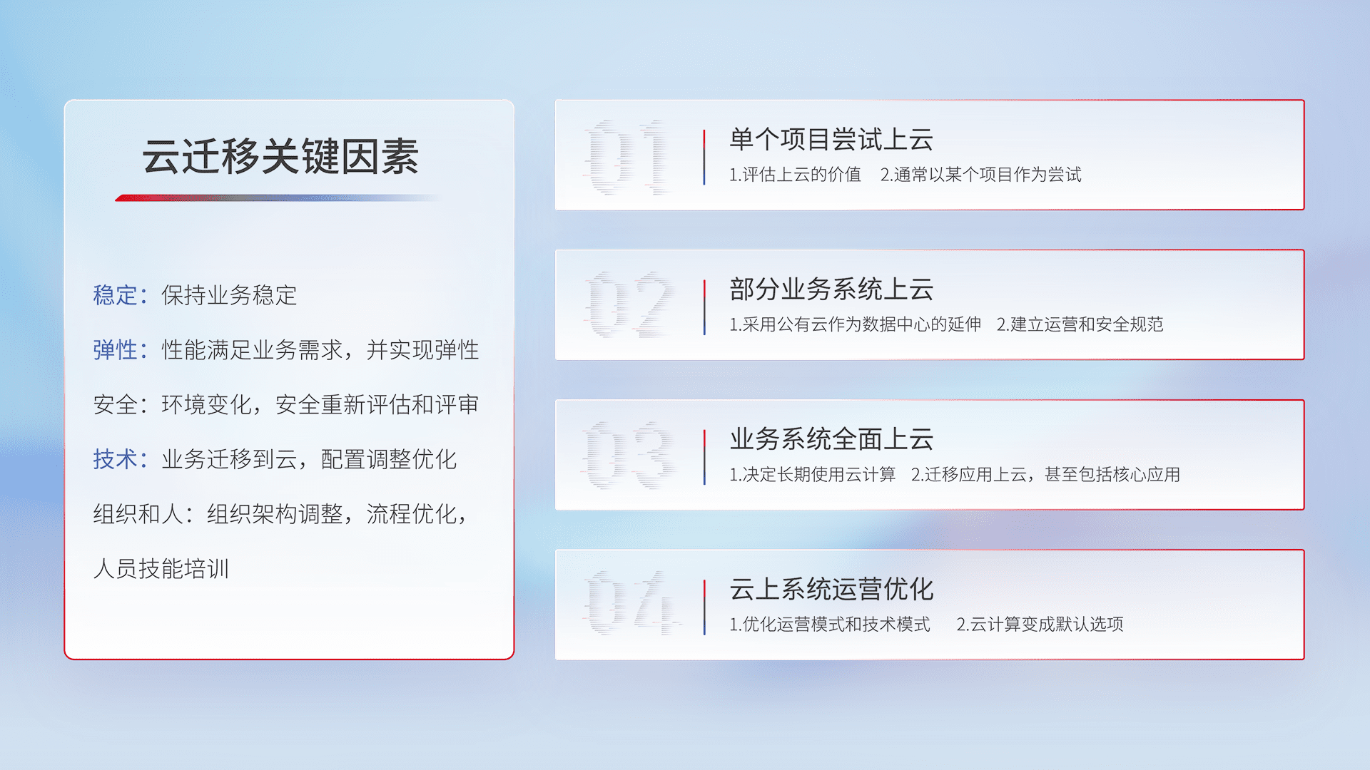 结合实际业务,,,,从规划设计、、、、云平台选型、、云原生改造、、数据迁移、、集成交付,,,,迁移全过程为客户识别最佳上云路径,,做好风险识别管理,,,设计网络架构、、、身份权限、、、安全审计合规、、、、操作审计、、日志审计、、、监控告警策略、、、多站点容灾设计等,,,对云上基础设施进行整体规划,,提升IT治理水平,,,,以满足弹性、、、、高可用、、高性能的需求。。。
